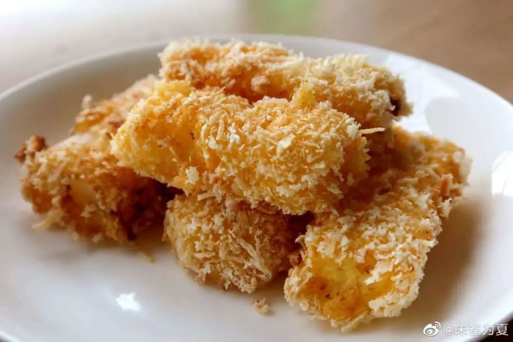 裹依次裹上淀粉、鸡蛋液、面包糠,放入六成油温的油锅中炸3分钟即可。