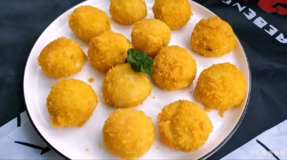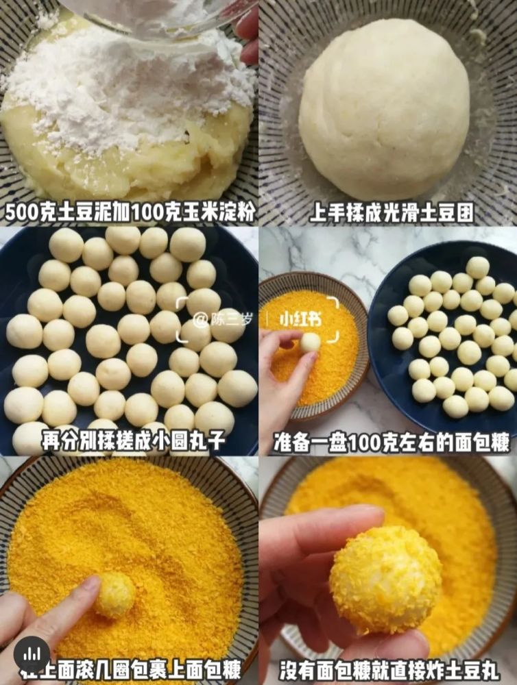 土豆泥放入100g玉米淀粉揉搓成光滑土豆团,然后再分搓成小圆丸子,准备一盘面包糠,丸子裹上面包糠;