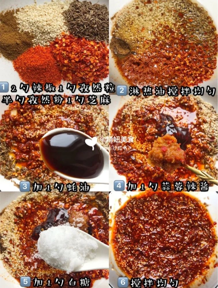 炸酱汁:1勺细辣椒粉+1勺粗辣椒粉+1勺孜然粒+1勺孜然粉+1勺芝麻,加热油拌匀,拌匀后再加1勺蚝油+1勺蒜蓉辣椒酱+1勺白糖,搅拌均匀备用;