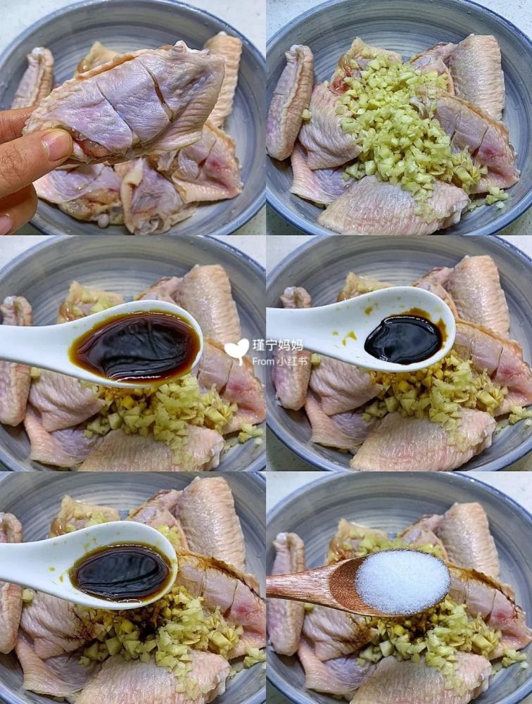 鸡翅划上两刀方便入味,加入蒜末、生抽、老抽、陈醋、盐、糖、黑胡椒碎,抓匀腌制2小时以上;