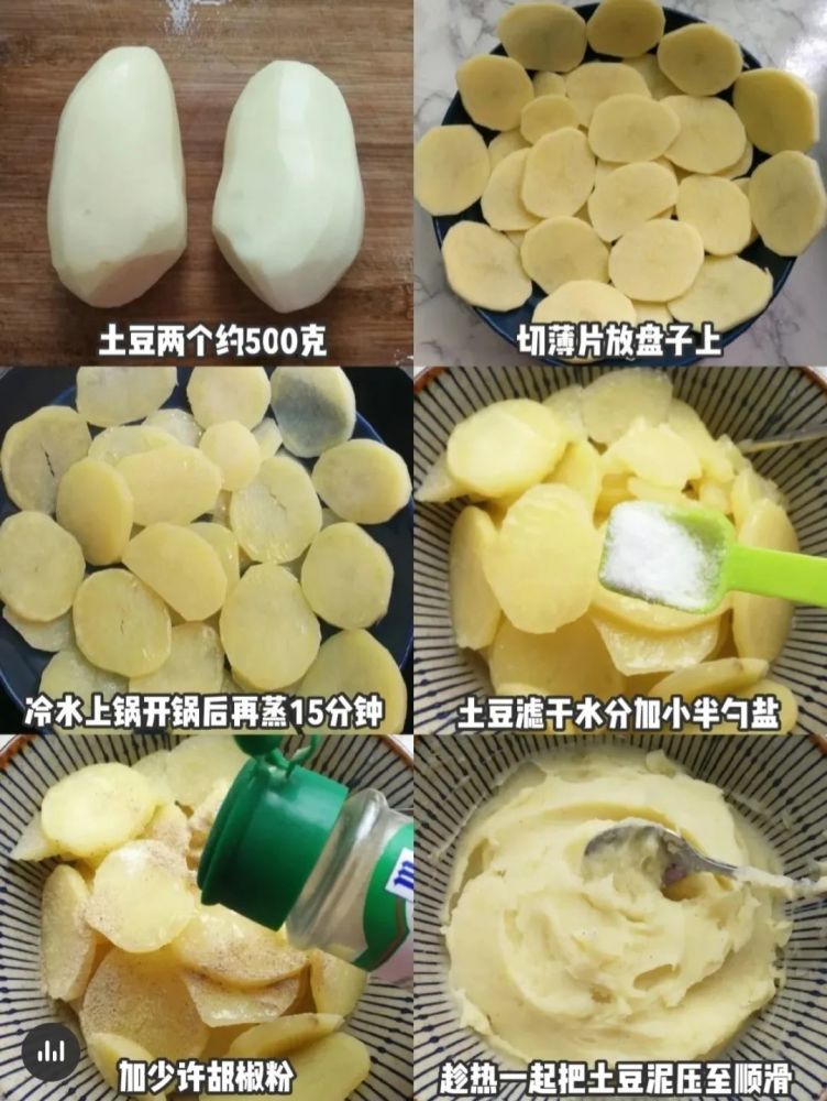 土豆切薄片冷水上蒸锅,开锅后再蒸15分钟左右,蒸熟的土豆片滤出水分,加少许盐和胡椒粉压烂;