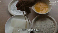 将冻好的雪碧切成小块,依次裹上淀粉、蛋液、面包糠,放入油温高的锅中油炸,炸5-8s即可。