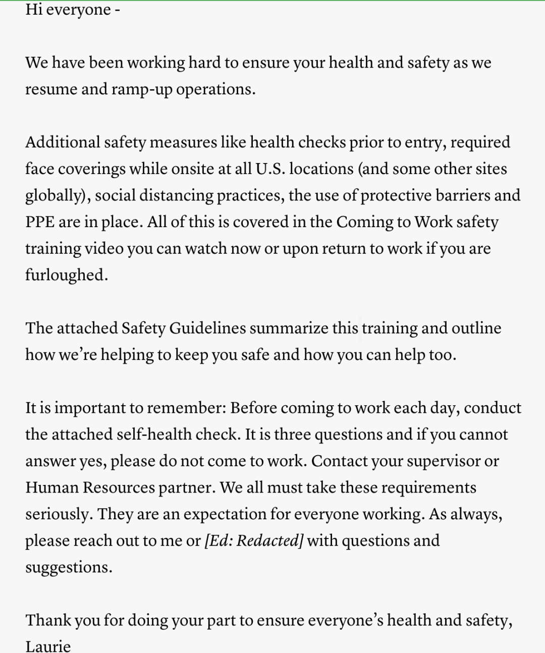 特斯拉负责环境、健康和安全的副总裁劳里·谢尔比(Laurie Shelby)上周五向特斯拉在美国的所有员工(包括工厂、展厅和销售人员)发了一封电子邮件,列出了健康和安全指导方针。