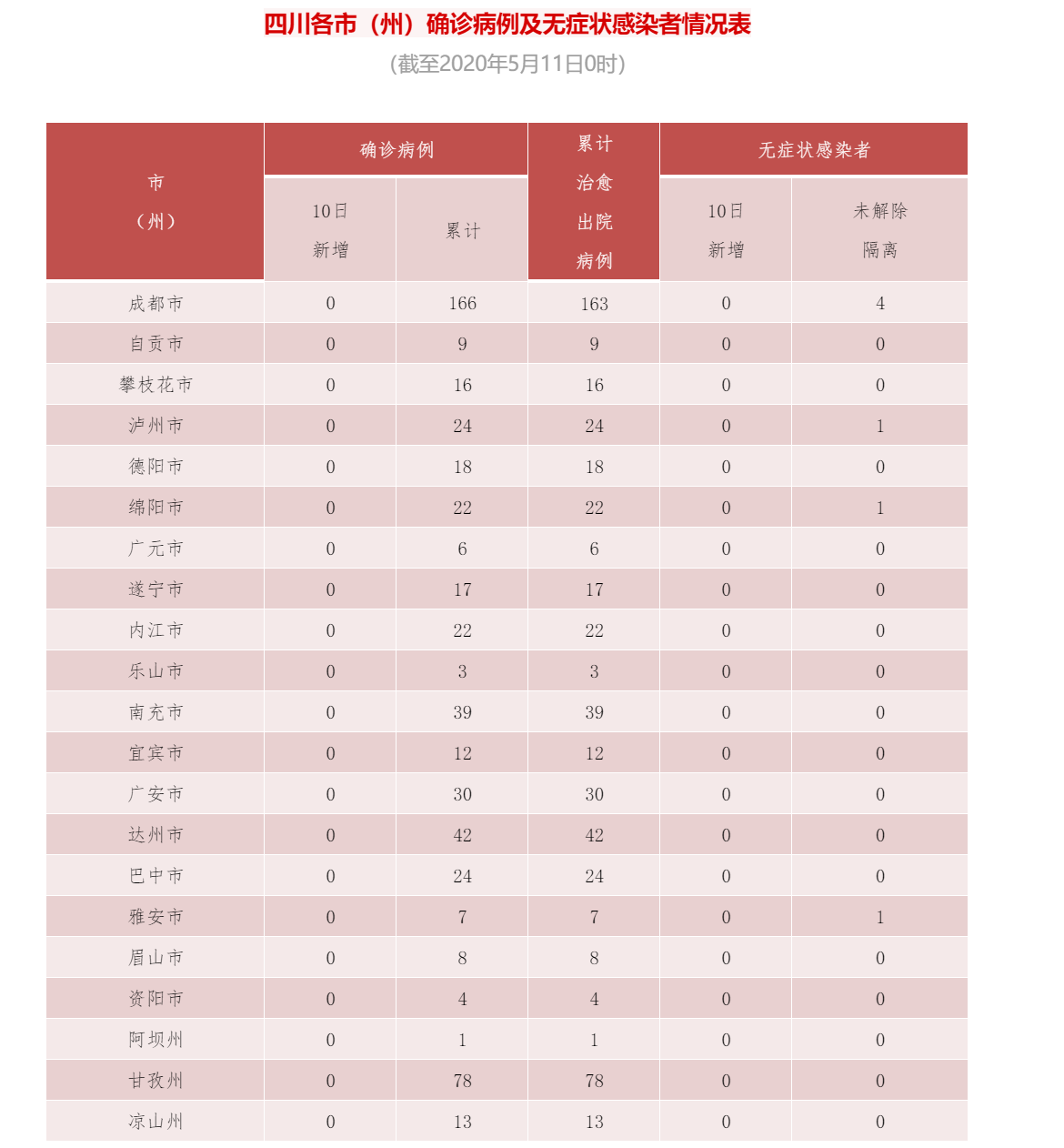 据四川卫健委消息,5月10日0-24时,四川无新增新型冠状病毒肺炎确诊病例,无新增疑似病例,136人尚在接受医学观察。