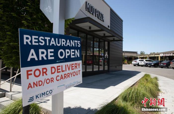 当地时间5月9日,美国硅谷腹地库比蒂诺商圈的出入口挂上了“餐馆营业,只能外卖或自取”的标识。 中新社记者 刘关关 摄