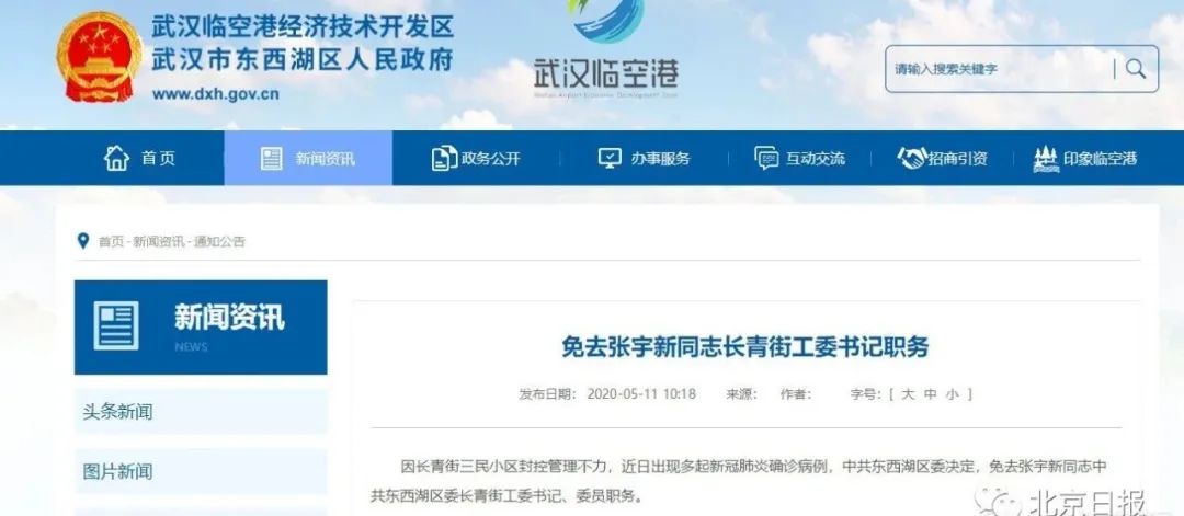 据武汉市东西湖区政府官网5月11日10时18分消息,因长青街三民小区封控管理不力,近日出现多起新冠肺炎确诊病例,中共东西湖区委决定,免去张宇新同志中共东西湖区委长青街工委书记、委员职务。
