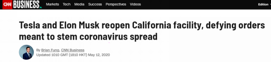为了防止新冠病毒扩散,加州在3月下旬宣布“封城”,然而“封城”令不可避免对当地行业造成冲击。对此,据美国有线电视新闻网(CNN)报道,马斯克12日在推特上对阿拉米达县“开炮”。他写道:“即使违反阿拉米达县的规定,特斯拉今天将重启生产。我将与其他人一起上线。如果有人(因此)被捕,我要求只逮捕我。”↓