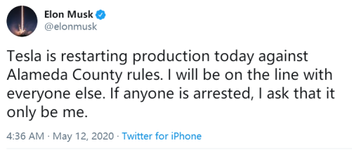 [环球网报道 记者 乌元春]美国新冠肺炎疫情形势仍然严峻,作为疫情严重地区之一的加利福尼亚州目前尚未完全解除限制措施。也正是因为这个原因,急于复工的特斯拉首席执行官马斯克和加州的一个县“杠”上了。马斯克12日在推特上发文说,即使违反加州阿拉米达县的规定,特斯拉仍准备复工。他甚至还言辞激烈地表示,“如果有人被捕,我要求只逮捕我”。