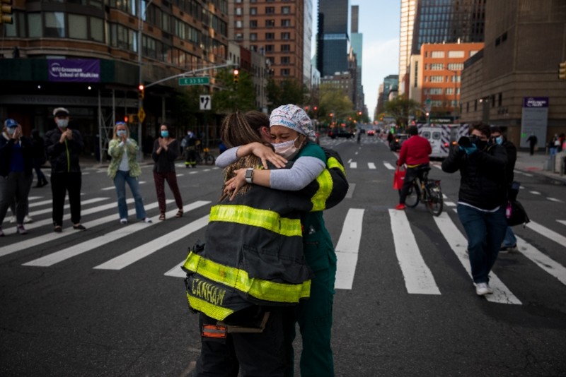在美国纽约一家医院外,一名纽约消防员与一名从阿拉巴马州前来支援的护士拥抱表示感谢。 新华社发