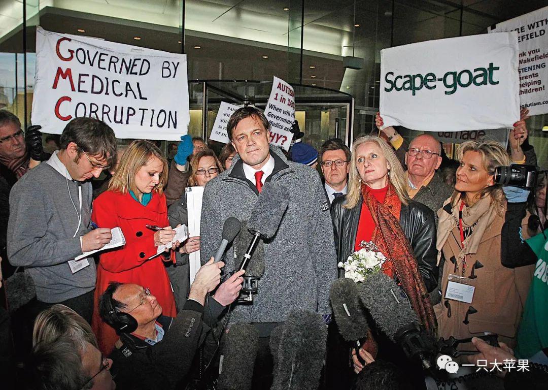 Andrew Wakefield从学术不端的听证会出来后,仍有不少人打出“替罪羊”的旗号对他表示支持。来源:newsweek