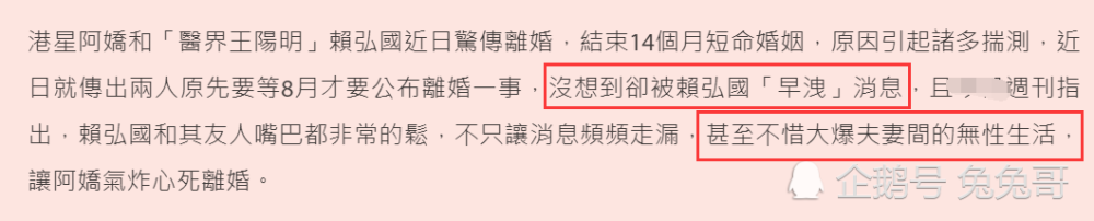 另外还有关于赖弘国本人身体情况的一些传闻,台媒称赖弘国与阿娇离婚,是因为身体原因,最终导致离婚。