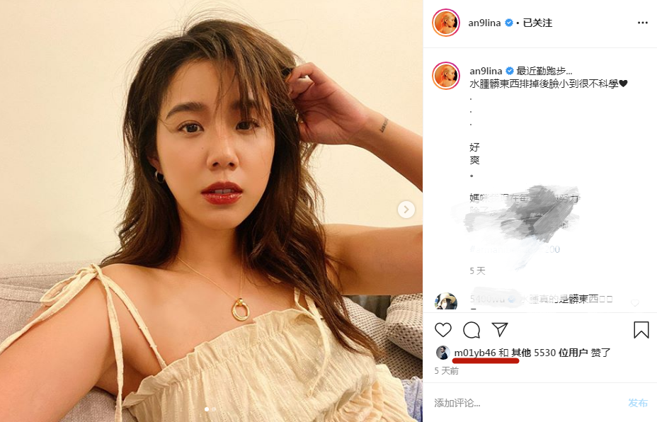 顺藤摸瓜,翻开赖弘国绯闻女友的IG发现,几乎绯闻女友每次晒美照或者生活日常,赖弘国的点赞都不会缺席,每隔几天赖弘国都会点赞她的美照。