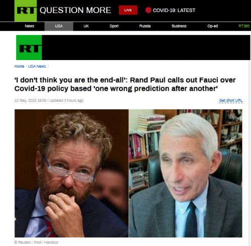 RT称,会上,同样拥有医学学位的参议员保罗却对福奇支持暂缓经济重启计划的观点提出了质疑。