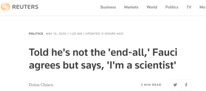 “我是一名科学家、医生与公共卫生官员。我根据最佳的科学证据提出建议……我不会就经济问题给出建议。除了公共卫生,我不会给出其他领域的建议。”福奇说。