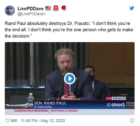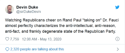 有网友说,“看着共和党人为兰德・保罗与福奇‘较量’而欢呼,几乎完美地刻画出共和党反智、反理性、反事实并且堕落。”