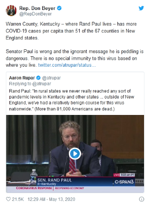 弗吉尼亚州民主党众议员唐・拜尔(Don Beyer)写道:“兰德・保罗居住的肯塔基州沃伦县感染新冠的比例比新英格兰地区67个县中的51个县还要多。参议员保罗是错的,他所兜售的无知信息是危险的。不会因为你住在哪儿,就会对这种病毒有特殊免疫。”