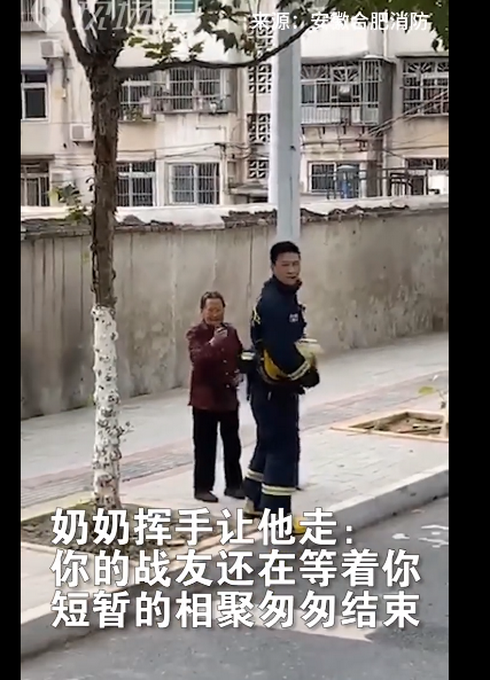 近日,一次出火警归来路上陈号春和奶奶在路边“偶遇” 。担心队友们等着急,陈号春一边询问奶奶的身体情况,一边不时回头看。看出了陈号春的心思,奶奶赶紧朝着他挥挥手:你的战友还在等着你……