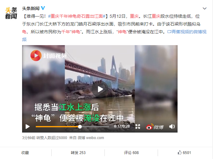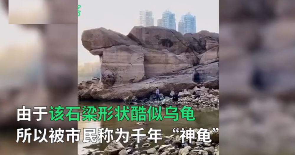 不少网友都说是因为天气炎热,长江重庆段水位持续下降,使得东水门大桥下的龙门皓月石梁浮出水面。由于这块石头的外形酷似乌龟,所以被市民们称为“千年神龟”。