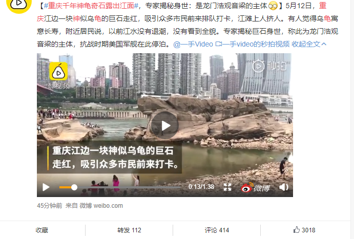 就在昨天,5月12日,重庆江边一块神似乌龟的巨型石头在网上突然蹿红,吸引了众多市民前去打卡。