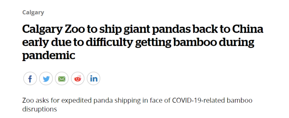 据加拿大广播公司(CBC)报道,受到新冠肺炎疫情影响,难以运来足够的新鲜竹子,加拿大艾伯塔省卡尔加里动物园提前两年将两只大熊猫“二顺”和“大毛”送回中国。