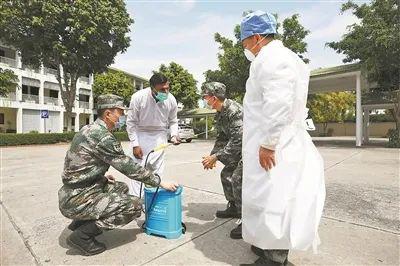 5月3日,在巴基斯坦拉瓦尔品第,解放军赴巴抗疫专家组成员指导巴方人员使用日常消杀器械。新华社记者 刘天 摄