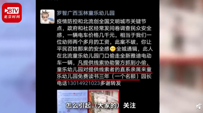 近日,广西玉林,一则“全城通缉”偷车贼的悬赏博文,在北流人朋友圈流传并走红网络。5月13日,北流市区一民办幼儿园内一辆电动车被盗,罗园长为了追回电动车,发文征集线索,并承诺“提供线索抓到偷车者,奖孩子免费读书3年”。罗园长表示,承诺是真的,相信一定能找到偷车人。