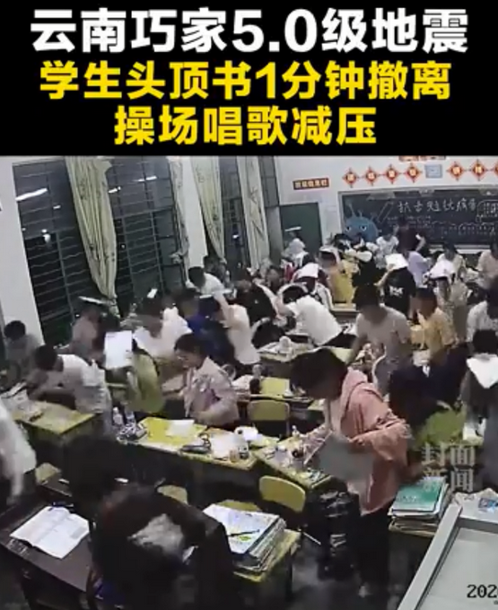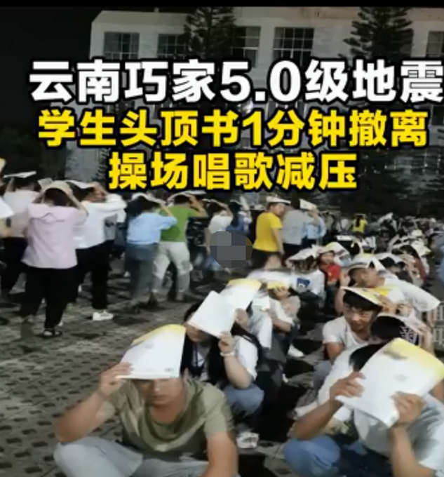 5月18日21时47分,云南昭通5.0级地震。地震发生时,巧家县第一、第二中学师生依照平时演练, 第一时间安排学生有序撤离。学生顶教科书护头分成两排,1分钟不到就有序撤离了教室。为调节紧张情绪,师生合唱"感恩的心",齐背古文减压。截至19日9时,#云南昭通地震已致4人死亡#,23人受伤。