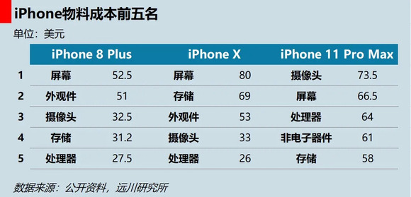 不过,厚道归厚道,贵也是真贵。在iPhone11之前,屏幕一直都是苹果手机各项硬件中成本最高的一项。