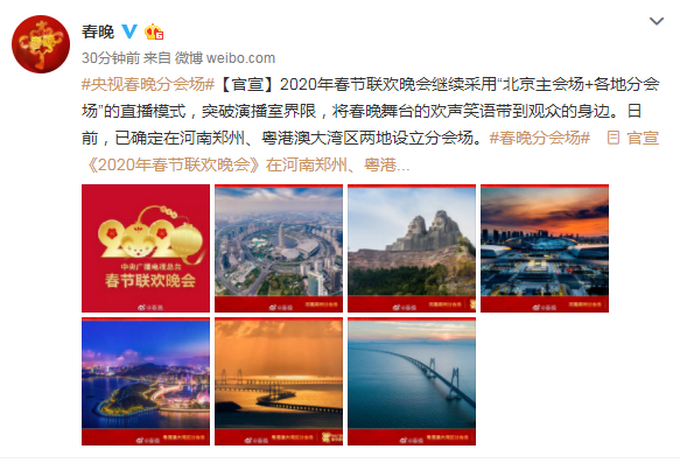 2020年春节联欢晚会继续采用“北京主会场+各地分会场”的直播模式,突破演播室界限,将春晚舞台的欢声笑语带到观众的身边。日前,已确定在河南郑州、粤港澳大湾区两地设立分会场。