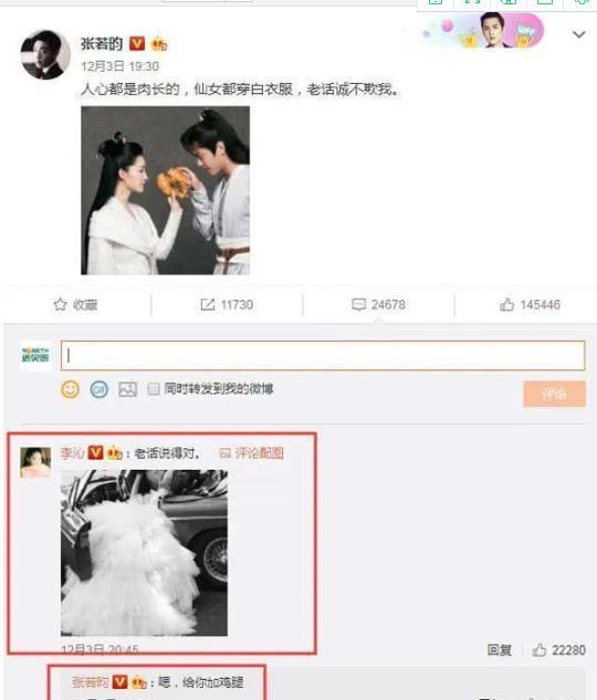 后来电视剧播出后,关于“鸡腿姑娘”的梗两个人进行社交媒体宣传,张若昀夸赞李沁飘飘白衣,“仙女都穿白衣,老话诚不我欺”。李沁紧随其后,在评论中回复了一张唐艺昕白纱的照片,回应了“老话说得对”。