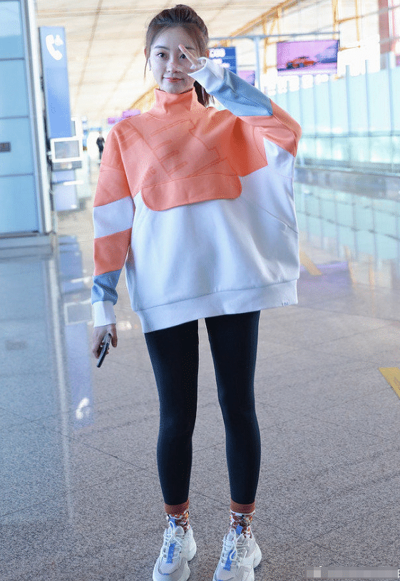 leggings最常见的搭配就是上身穿着一件宽松的卫衣或者是短袖t,脚上搭配运动鞋,祝绪丹这一套打底裤与拼色卫衣的搭配很有青春活力感,祝绪丹的腿虽然没有关晓彤那般细长,但腿型也是蛮好看的,穿上leggings很好的修饰出了她的腿型,脚上袜子包裤腿的穿法也很时尚。