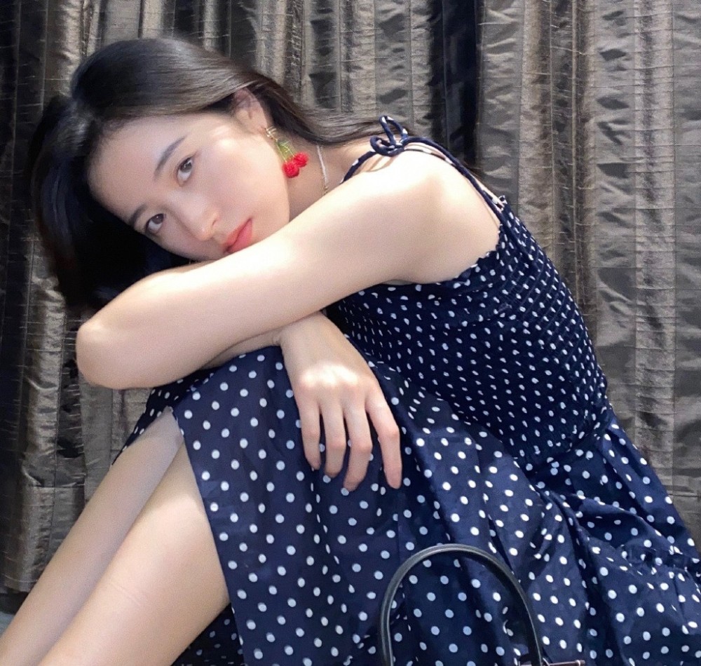 周雨彤身穿蓝色的波点吊带裙,映衬得肌肤更加白皙透亮,显得非常清爽,感觉十分舒适,同时复古韵味也是很浓郁的。