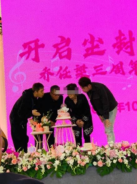 活动现场,乔任梁的父母以及其亲友一同吹熄粉色蛋糕上的蜡烛——