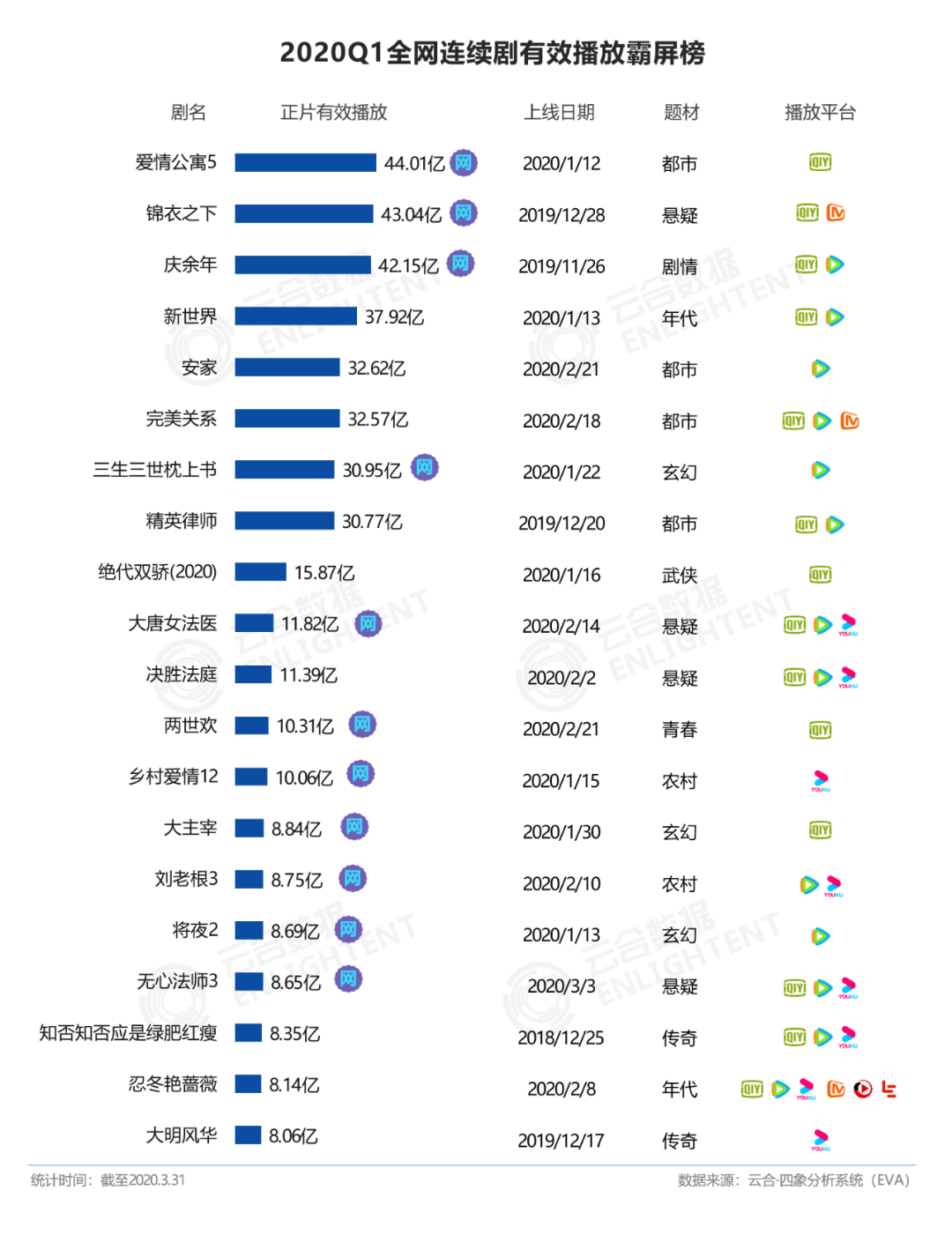 疫情之下,所有娱乐都不得不转到线上,因此即使上新数量缩减,Q1的剧集也迎来了一个新的流量高峰。