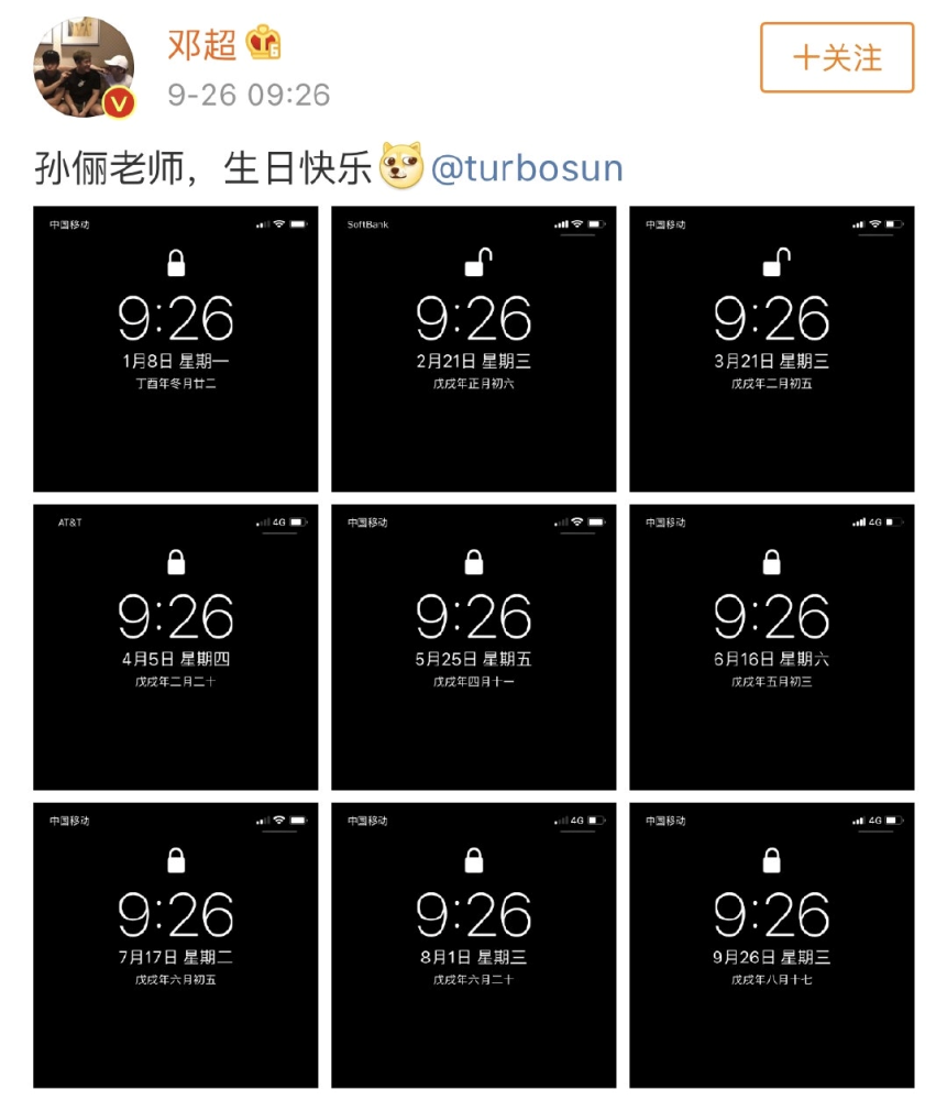 邓超说:“我对数字很敏感,经常看到时间刚好是九点二十六分,而她的生日刚好在9月26日,我就会截图给她看。”