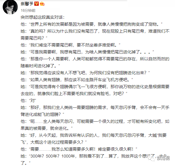 近日,张馨予再次罕见地秀恩爱。她在自己的社交平台上,晒出了与老公何捷的日常聊天对话。张馨予化身“十万个为什么”儿童,何捷则不厌其烦的有问有答。夫妻两个人围绕着“人需不需要尾巴”“需不需要翅膀”聊了好长一段时间。“她”(张馨予)貌似在耍无赖,“他”始终耐心地解释再解释。张馨予在讨论区补充说明:其实没有什么重要含义,就是一段有趣的生活中的聊天。