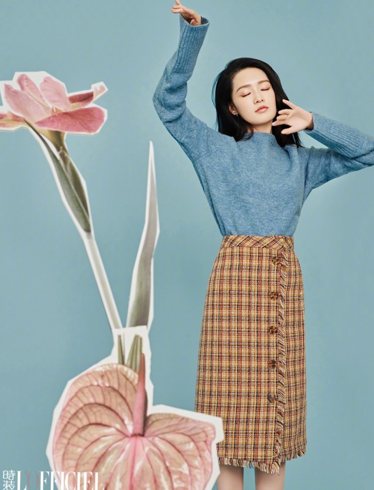 在这张图中,李沁身着深蓝色针织毛衣,下穿棕色格子中裙,选色考究和精致毛边设计的裙子搭配深暗色系的蓝色毛衣,满满的复古风。卷发随意披在双肩,优雅魅力呼之欲出。谁说这样的颜色显得沉闷老气,大胆利用撞色和富有设计心思的单品,巧妙搭配,沉稳的颜色也能穿出不一样的复古与时尚。