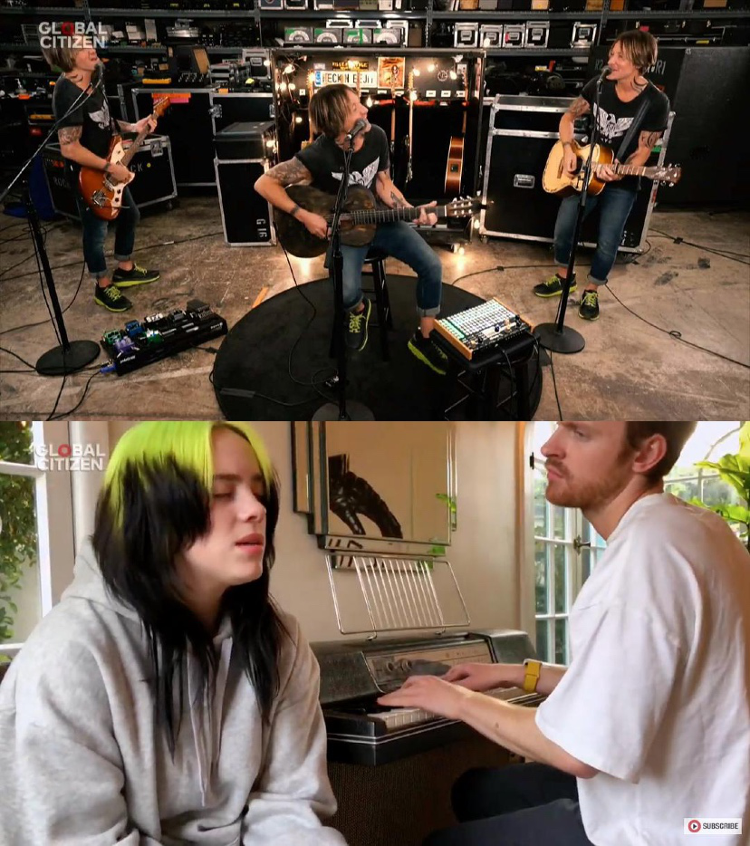Lady Gaga演唱了1936年卓别林电影《摩登时代》的片尾曲《Smile》;00后新生代音乐人碧梨(比莉·艾利什)和哥哥合作了一首温暖治愈的《Sunny》;艾美奖、格莱美奖、奥斯卡奖和托尼奖得主约翰·传奇与萨姆·史密斯在各家琴房合唱了《Stand by me》;澳大利亚乡村音乐人凯斯·厄本掌握了“克隆技术”,在自家排练房和两个分身挑起“三大件儿”;SuperM的七位成员在各自的空间热情演唱组合新曲《With You》。最终,Lady Gaga、席琳·迪翁、安德烈·波切利、约翰·传奇以及郎朗共同完成了《The Prayer》,为演唱会画上句点。