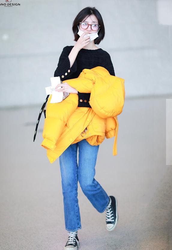 李溪芮选择的薰衣草紫色针织开衫真的是非常夸张的版型了,设计版型都很简单,最看不懂的就是Over size的宽大设计,明明李溪芮就是一个纸片型身材的人,宽松的开衫与她苗条的身材形成强烈的对比,看起来就更加的显瘦了,看这毛衣开衫的衣袖,都能够同时装下两个她了。