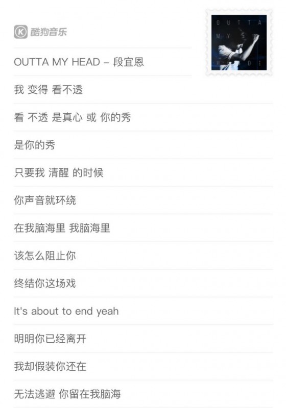 1月11日,段宜恩全新数字单曲《OUTTA MY HEAD》正式上线酷狗音乐。《OUTTA MY HEAD》是段宜恩作为Fan Meeting Special Song为歌迷送上的一份礼物,上线后就光速引爆收听热潮。