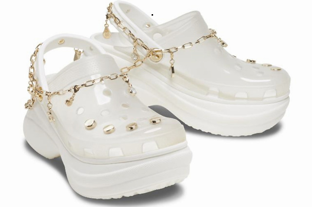 透明人造宝石厚底老爹洞洞鞋,则将经典洞洞鞋型与流线型厚底结合,特别选用金色铆钉智必星及同色系链条点缀鞋身,充满个性色彩及趣味性的同时,更能修饰腿型,打造修长美腿。