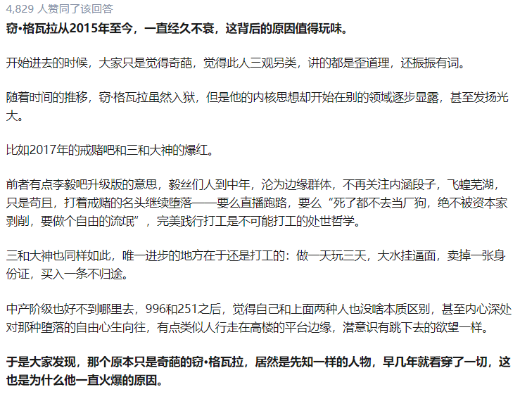 “随着时间的推移,窃格瓦拉虽然入狱,但是他的内核思想却开始在其他领域逐步显露,甚至发扬光大。” 一个近5000赞的知乎回答里,作者将窃格瓦拉与中年人“被迫式的精神堕落”联系在一起,称其为“先知一样的人物”。