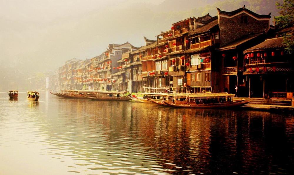 凤凰古城山水环绕,沱江作为古城凤凰的母亲河,绕着城墙缓缓流淌,水流缓和,两岸是充满古色古香气息的建筑,鳞次栉比;古韵虹桥与古风浓重的吊脚楼连成一片,让人不禁生出一种厚重和沧桑的感觉。来来往往的人儿,漫步在沱江两岸,恍惚间仿佛穿越到了古老的“边城"时代。