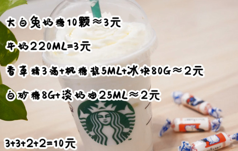小编一下子就被吸引了,难道星巴克真有这么便宜的价格吗?往下看了以后才发现,原来这名网友是先在星巴克买了一杯大白兔奶糖星冰乐,觉得价格有一些小贵,于是就回家自己制作了同款。只见他准备了十颗大白兔奶糖,接着剥开糖衣,用刀子把奶糖切碎,然后加入一些牛奶和香草精、枫糖浆开小火搅拌至融化。