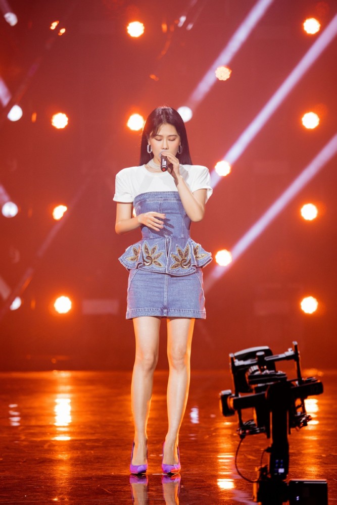 比起上面那一套偏霸气的舞台穿搭,这一套舞台穿搭就比较小清新了。白色的圆领内衬搭配牛仔抹胸皮裙,修身的裁剪勾勒出了窈窕的身材曲线。长发披肩,她刻意收敛了气场,偏向了清爽的少女风格。