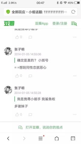 之前他有个豆瓣账号,名字叫做"张子明",至于是不是他本人,看看这个号在4年前发的照片就知道了。这其实并没有什么问题,最要的是他参与的话题尺度实在太大,大到我都不敢在文中说出来,大家还是看图吧。