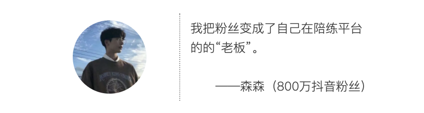拥有800多万粉丝的抖音大V森森(网络昵称)最早也是一位游戏陪练,在一次接单中偶遇MCN机构的老板,后者被他幽默搞笑的风格所圈粉,森森很快成为了MCN机构的签约网红,迅速吸粉,也把许多粉丝变成了自己在陪练平台的的“老板”。