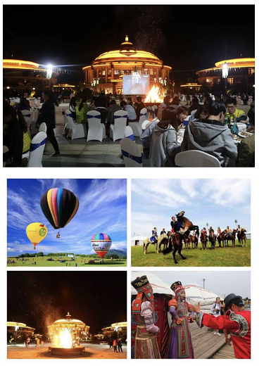 有独具满蒙特色的万马奔腾和悦广场、蒙古图腾苏鲁锭广场、马头琴广场以及御马苑停车场等景观。酒店配套有:房车营地、射箭、热气球、飞机、马术体验表演、小火车、星空房、儿童乐园等娱乐设施(分季节开放)。