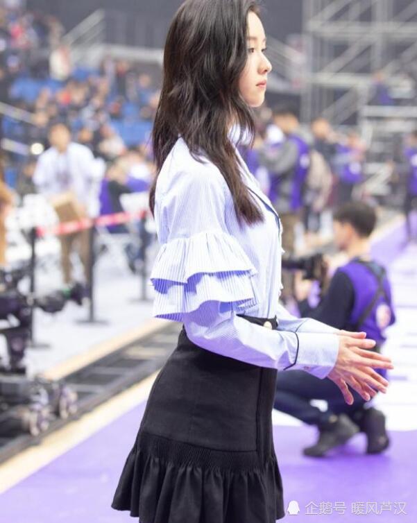这身服装看起来并没有太惊艳,但是陈都灵这身造型也是清新自然的同时又有着一些小设计的,看这袖子也是做了假两件的效果,上面一半是荷叶边的设计,甚至还有点叠层效果,而黑色的半身短裙更是如此,荷叶边的裙摆设计,让陈都灵整个人看起来可爱加分。