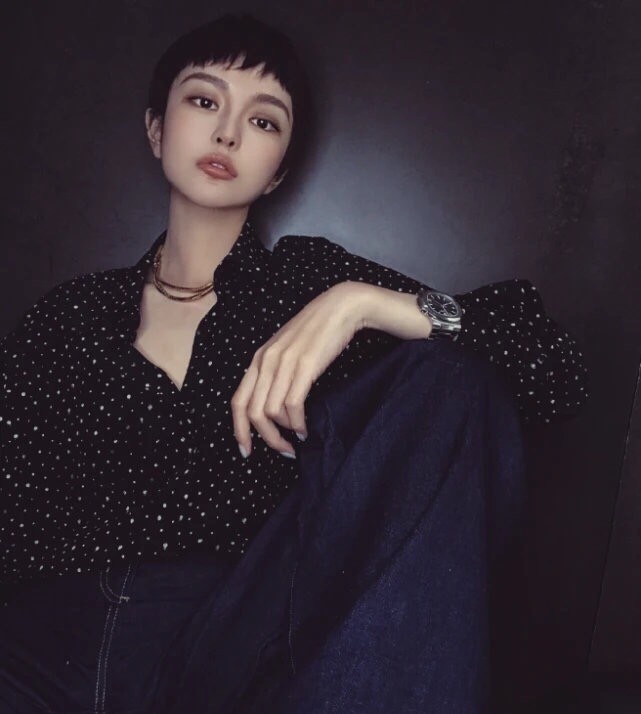 细看周扬青的双眉形状充满了英气,酷帅有型。一头精悍的短发与她的气场更加搭对。一双眼睛中性感十足,十分帅气。在短发参差不齐的短刘海之下把她的脸颊形状衬托得更下修长,下巴微尖更加增添了几分硬朗气质。手指上哥特式的刺青图文极致彰显肆意不羁的个性。全身暗暗的黑色基调,内搭点点白色波点的雪纺衬衫,雅痞兼具,很是耐看。